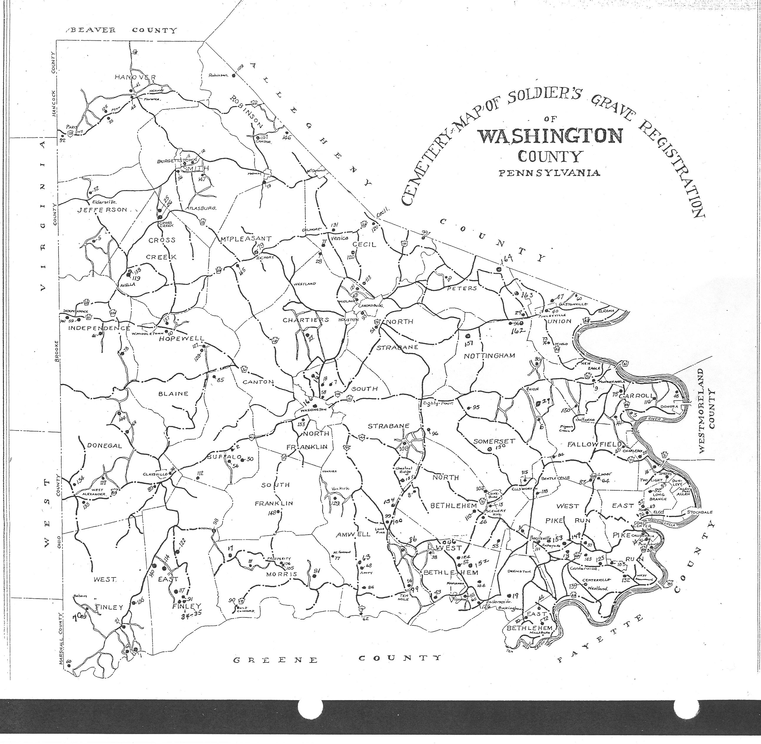 The indexes above contain names of veterans that are buried in cemeteries throughout Washington Co, PA. The majority of these veterans served in the Revolutionary War (R), War of 1812 (1812), Civil War (C), Spanish American War (SA), Mexican War (Mex), Indian Wars (I) and World War I (W). There are a few National Guard, Boxer Rebellion, Canadian Soldiers and some buried oversees with just a memorial in these cemeteries. There are maps that accompany this listing and copies of them can be found at the Washington County Courthouse in the Law Library, and at the Planning Commission office in Washington Co. near the courthouse. Scanned copies of the maps can also be found in the Western Pennsylvania Historical Society Library and Archives located in the Heinz History Museum and Sports Center in Pittsburgh, and I have a copy of the scanned maps as well. These maps were created as part of the Works Projects Administration (see below) in the 1930s. The maps have listings on the side of the veterans buried in each cemetery, their location within the cemetery and what war the veteran served in (when this info was available). I have created an all name index from these maps and that is what you will find in the following pages. Below is a listing of the cemeteries that these maps cover. The notations about what certain private farms are called is as they were at the time the maps were made, not what they may be called now. I don't think the listing for Washington Cemetery is complete - there were only a few sections listed in the maps. I also know of at least one private family cemetery that is not on the list and it has a few Revolutionary War veterans buried - Wise Cemetery. So the list is not complete but it is a good resource anyway.