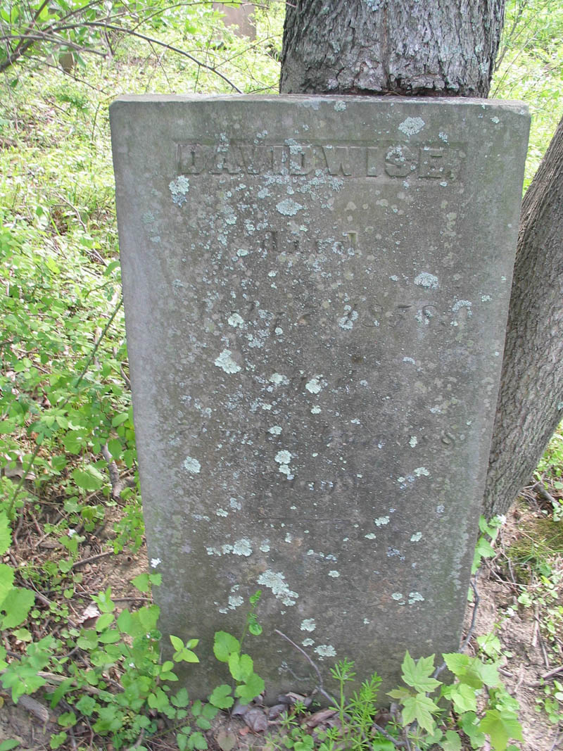 David Wisedied July 7, 1858 Aged 71 yrs, 4 mo and 8 days (this date and age are taken from the 1930s transcription of this cemetery. The stone is very hard to read now. This stone did not show up on the 1982 listing)