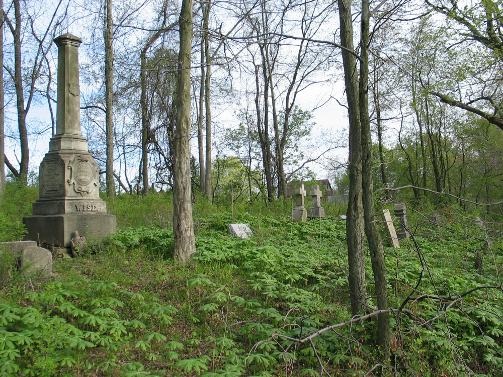 Old Wise Cemetery. You can see the old house way in the background behind the two cross tombstones. The tall family tombstone to the far left is how I found the cemetery. We were standing up at the house trying to find the cemetery and as I looked around I could just see the tall white stone in the woods in the distance. You can also see how overgrown the cemetery is and why I was watching for snakes, thorns, poison ivy, etc. !!